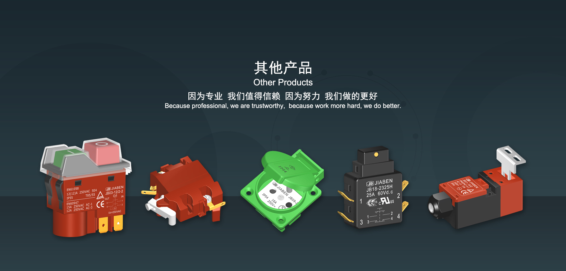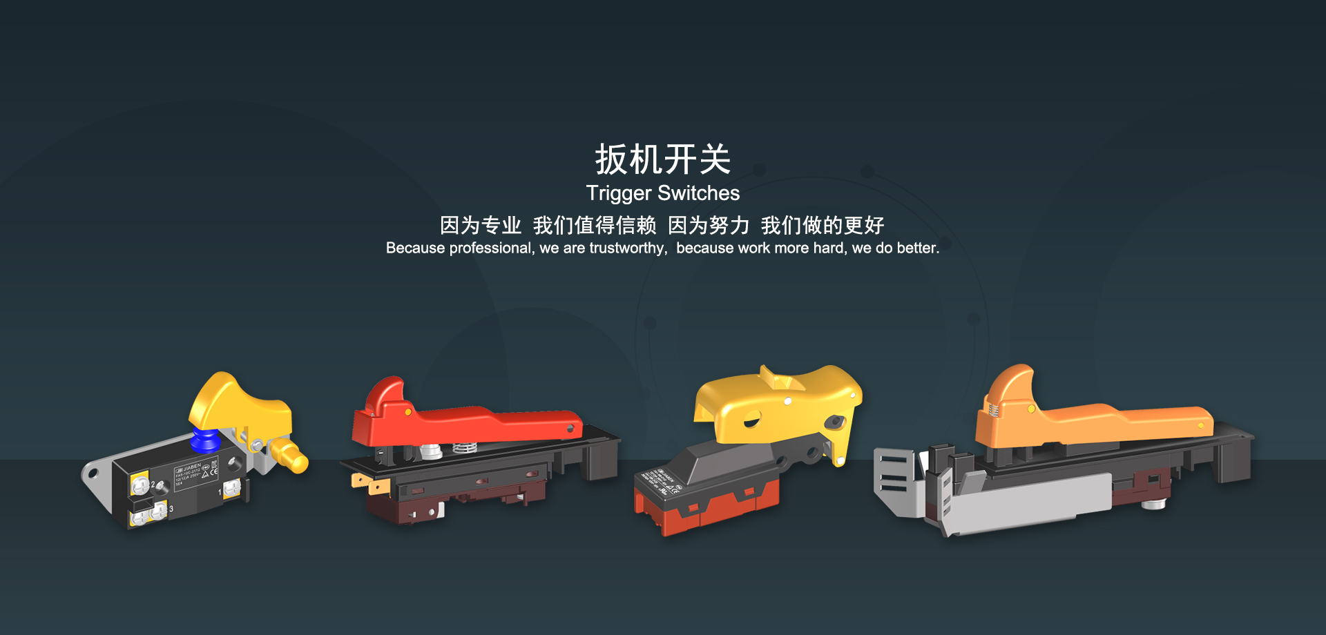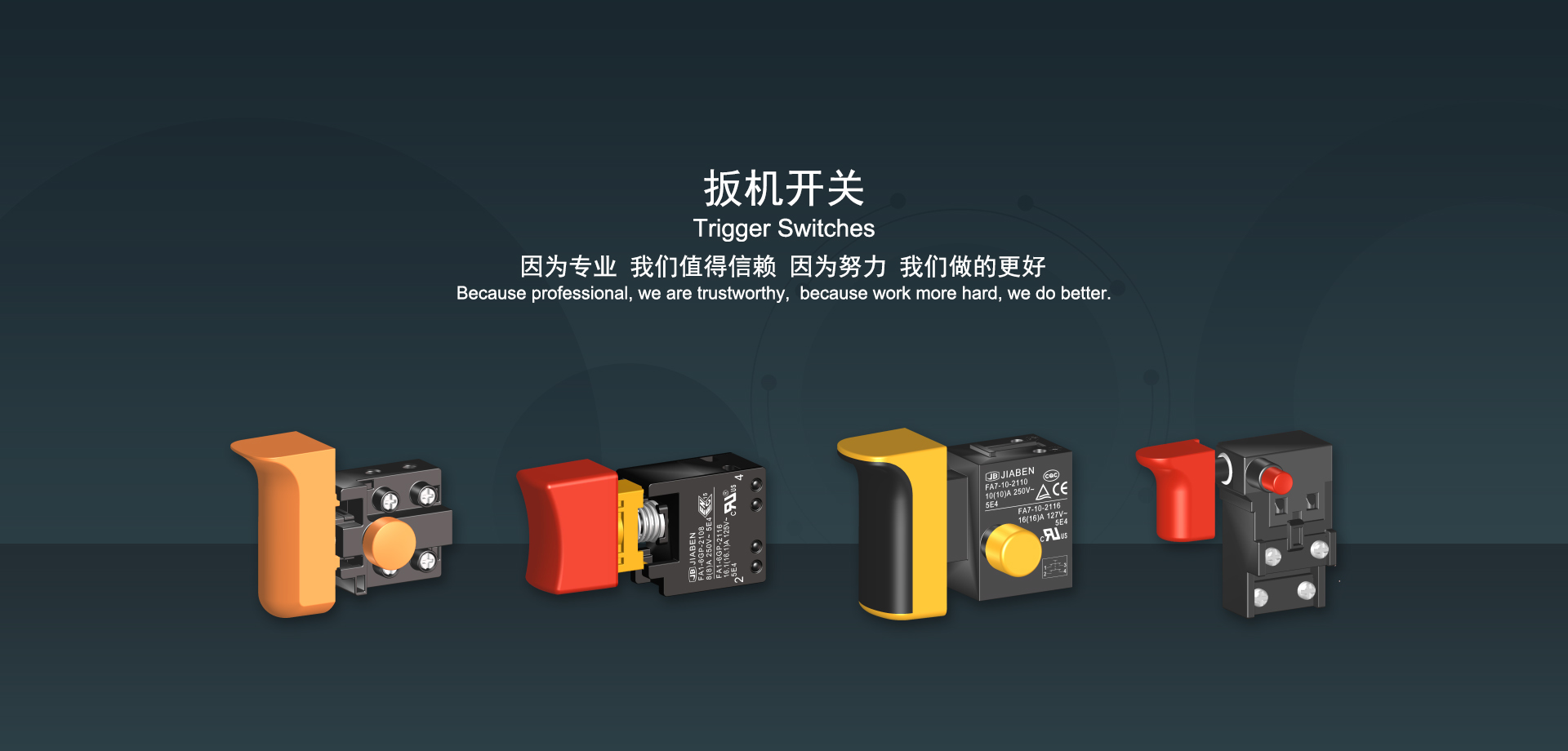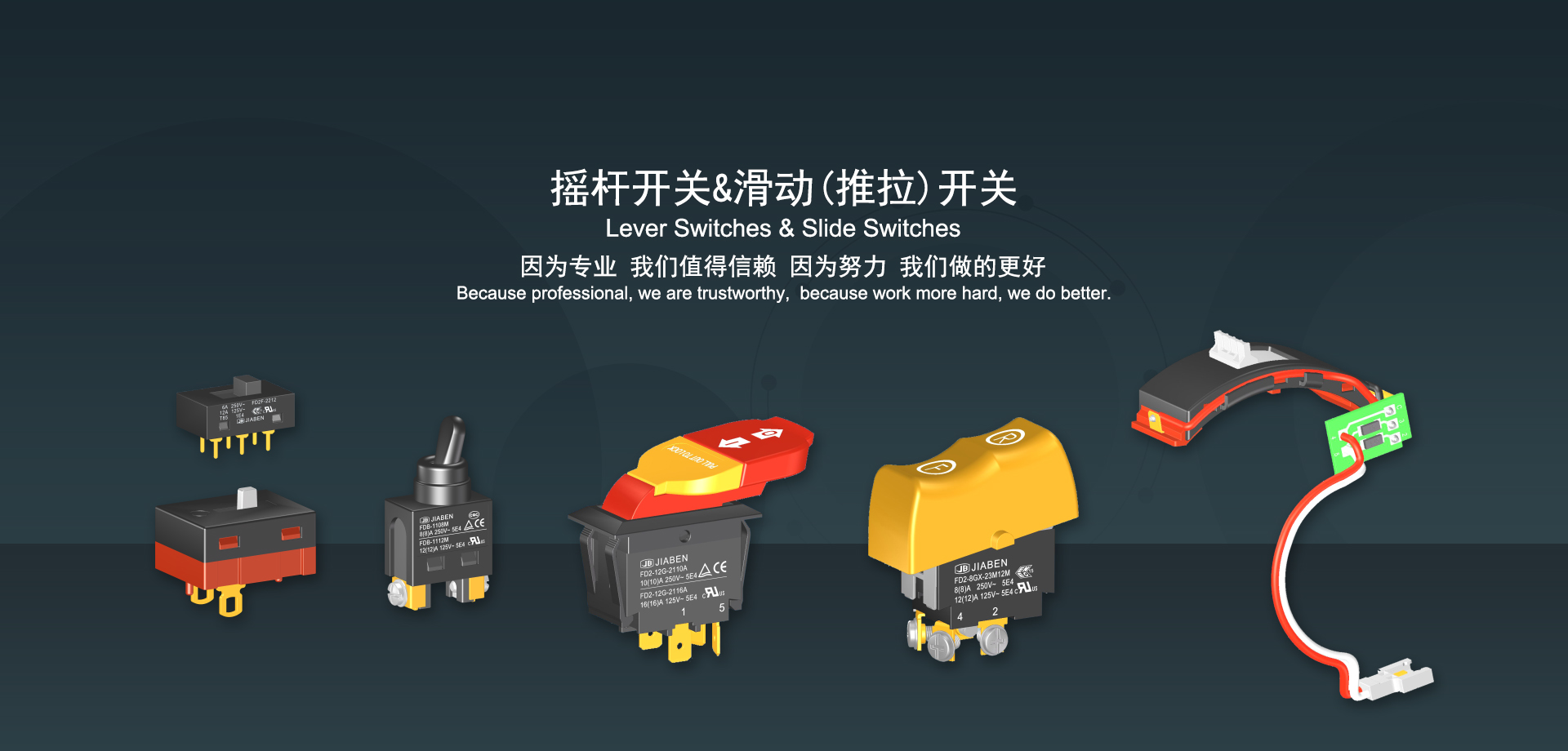 浙江佳奔電子有限公司始建于1986年,坐落于浙江省樂清市虹橋鎮(zhèn)東電子信息產(chǎn)業(yè)園內(nèi),現(xiàn)有職工700多人,資產(chǎn)總額超3億元。公司主要經(jīng)營“JIABEN”牌微動開關(guān)、蹺板開關(guān)、按鈕開關(guān)、扳機(jī)開關(guān)、調(diào)速開關(guān)和電位器開關(guān)等各類交、直流器具開關(guān)和各類交、直流線路板模塊等產(chǎn)品,主要應(yīng)用于交、直流電動工具、電動園林工具、清潔器具、家用電器和小型機(jī)床等行業(yè),是集產(chǎn)品設(shè)計(jì)、研發(fā)、制造、銷售和服務(wù)于一體的國家高新技術(shù)企業(yè)。JIABEN was founded in 1986, located in East Electronic Information Industry Park, Hongqiao Town, Yueqing City, Zhejiang Proviance, existing staff more than 700 peoples, more than 300 million RMB worth of assets. Company is mainly engaged in "JIABEN" brand Micro Switch, Rocker Switch, Push-button Switch, Trigger Switch, Speed Regulating Switch, Potentiometer Switch and other kinds of appliance switch and all kinds of AC or DC circuit board module, such as more than 100 series, 8000 kinds of models of products, mainly used in AC or DC Power-tools, Power Gardening Tools, Cleaning Appliances, Household Appliances and Small Machine Tool and other industries, is the collection product design, research and development, manufacturing, sales and service in one of the national high and new technology enterprise.